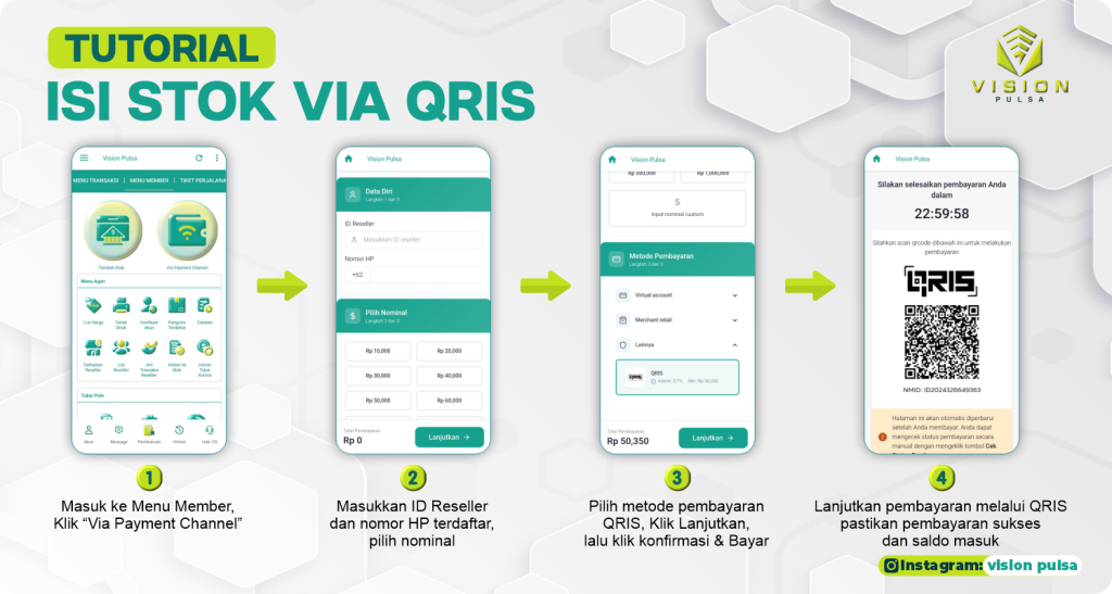 5. Pilih QRIS sebagai metode pembayaran Scan kode QRIS yang didapat dari pihak Vision Pulsa